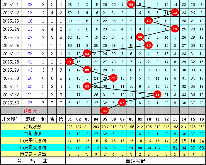 蓝球分析:奇数蓝球最近走势活跃,本期看好蓝球再开奇数,参考号码05、07、09、13。