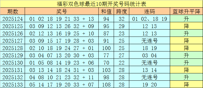 上期开奖:福彩双色球第2025133奖号开出:05 14 17 19 20 33 + 07,红球号码和值为108,首尾间距为28,包含连号:19 20。