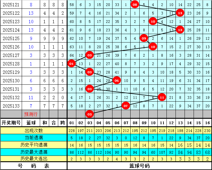 蓝球分析:前5期蓝球号码分别开出:03、06、03、11、07,其中奇数蓝球开出4期,表现相对较热,本期看好奇数蓝球继续出现,关注蓝球号码03。