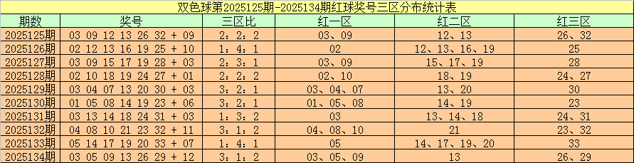 双色球第2025134期奖号为:03 05 09 13 26 29 + 12,红球三区比为3:1:2。