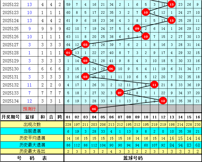 1路红球上期出现1个:13,走势温冷,最近50期1路红球出现99个,前10期1路红球开出20个,走势与理论相当,本期注意1路红球逐渐温冷,预计开出1个,注意红球:25。