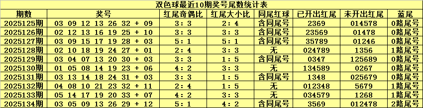 最近10期双色球红球尾数0-9开出频次分别为:尾数3出现13个,尾数9出现9个,尾数4出现7个,尾数2出现6个,尾数0 5 8出现5个,尾数7出现4个,尾数1 6出现3个,尾数0-9全部出现。本期注意尾数:013489,不看好开出同尾红球。