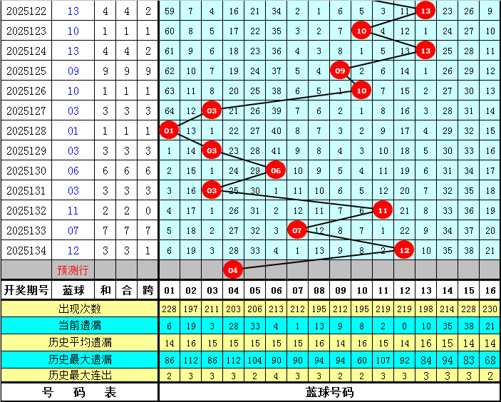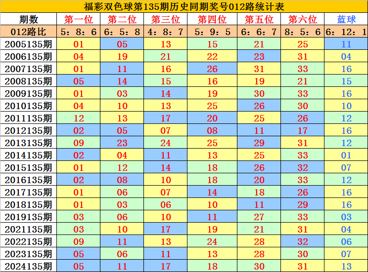 蓝球分析:第135期历史同期蓝球号码012路比开出6:12:1,其中2路蓝球明显偏少,本期放弃2路蓝球,关注蓝球04。