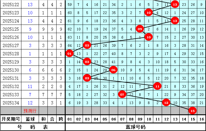 红球首尾和分析:上期红球龙头、凤尾号码分别开出03和29,红球号码首尾和为32,对比第2025133期首尾和下降了6点,最近5期红球首尾和升降走势为:下降-上升-上升-上升-下降,本期预计红球首尾和下降,预计龙头、凤尾号码开出01和29。