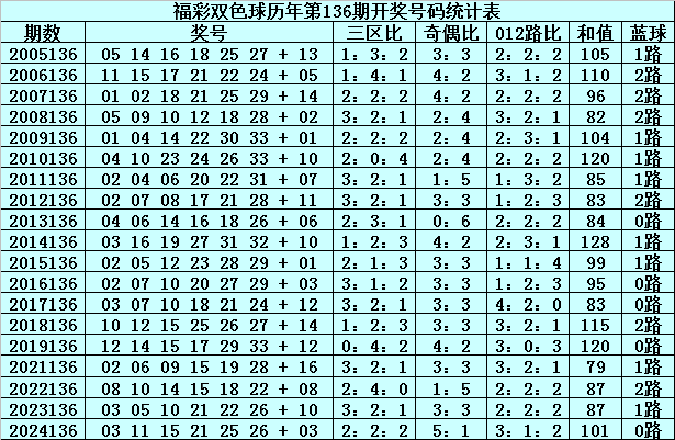 在第136期历史同期奖号中,红球三区分布总比例为39:42:33,奇偶总比例为53:61,012路比为42:36:36,和值分布在79-128之间,蓝球号码012路总比例为5:8:6。