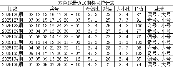 双色球第2025135期奖号为:01、02、05、09、25、32+10。其中红球和值为74,奇偶比为4:2,大小比为2:4,蓝球为偶数、大号。