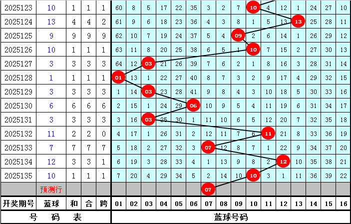 前9期开出7个蓝球号码,蓝球以冷码为主,热码蓝球开出相对较少,还没有出现的蓝球为:02、04、05、08、09、13、14、15、16,共9个,本期注意热码蓝球出现,一码蓝球参考07。