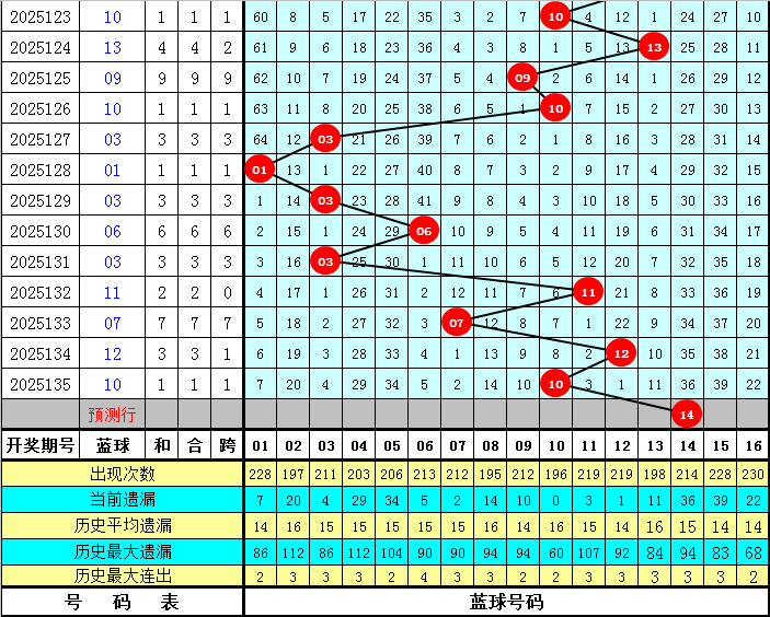 蓝球分析:去年同期开出蓝球号码03,该号码在历史同期奖号中出现了2次,表现比较活跃,今年同期可以继续关注历史同期已开出的蓝球号码,参考号码14。