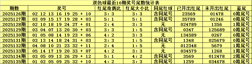 双色球第2025135期奖号为:01 02 05 09 25 32 + 10,红球尾数为:1259,包含同尾红球:02 32、05 25。