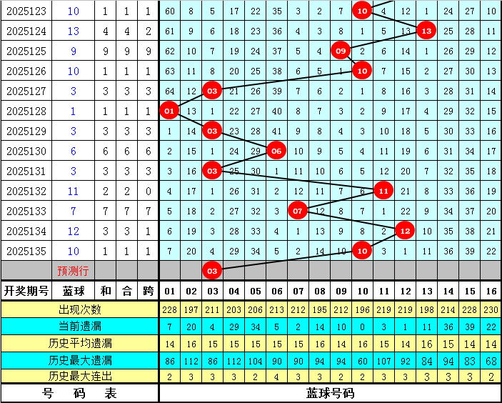 蓝球分析:蓝球上期开出大号10,最近10期蓝球号码大小比为4:6,小 号蓝球走势活跃,本期预计小 号蓝球再出,独蓝参考03。