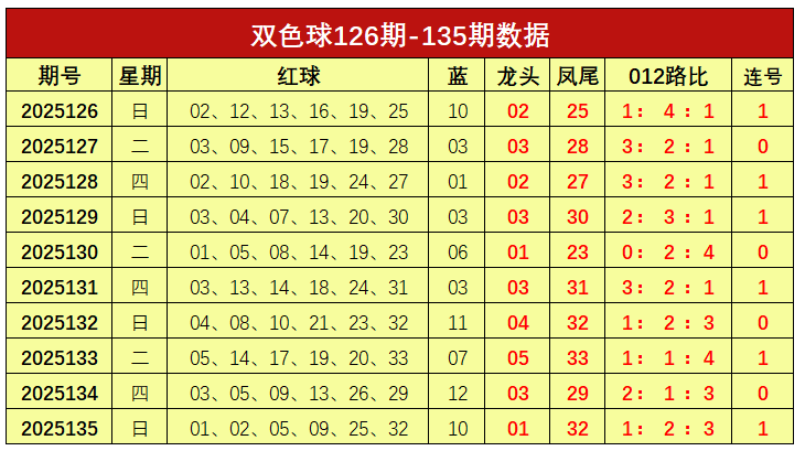 双色球第2025135开奖奖号:红球01、02、05、09、25、32,蓝球10。龙头01,凤尾32,012路比为1:2:3,开出1组连号。