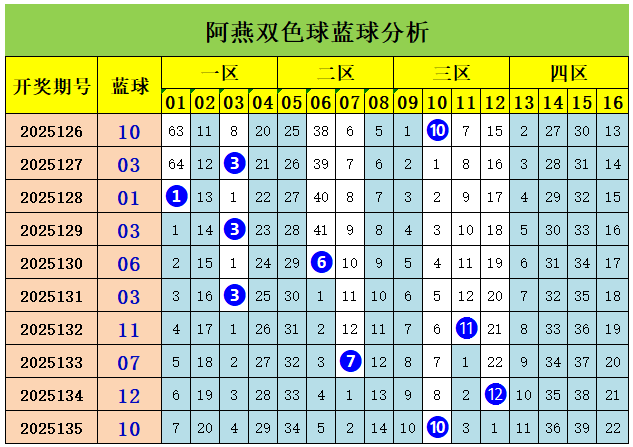 上期回顾:双色球第2025135期开出奖号:红球01、02、05、09、25、32;蓝球10,其中红球三区比为4:0:2,奇偶比4:2,大小比为2:4,蓝球开出1路号码10。