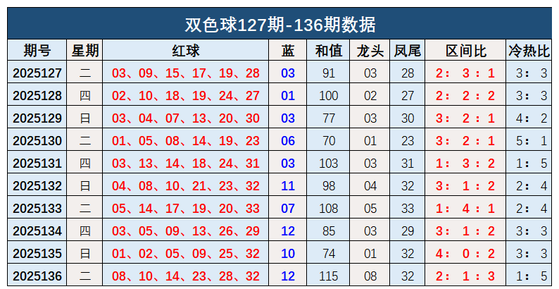 双色球第2025136开奖奖号:红球08、10、14、23、28、32,蓝球12。和值115,龙头08,凤尾32,区间比2:1:3,冷热比1:5。蓝球开出大数号码12。