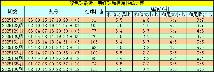 双色球红球最近10期开出和值分别为:91、100、77、70、103、98、108、85、74、115。
