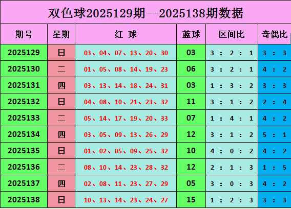 双色球第2025138期开奖:本期开奖号:10 13 14 23 24 27。蓝球:15,奇偶比为3:3。