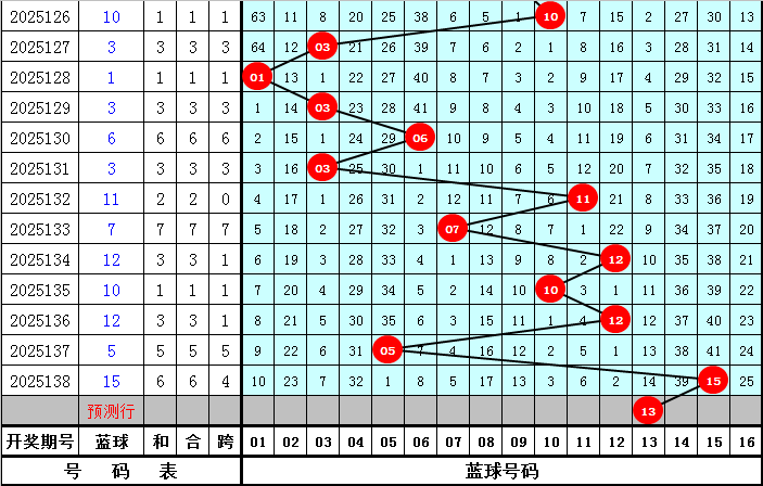 蓝球分析:上期开出蓝球号码15,蓝球遗漏值为35,温冷蓝球近期开出比例较高,本期防冷码蓝球继续解冻,参考蓝球号码13。