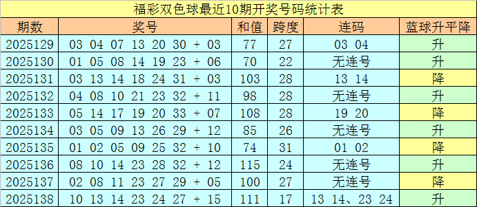 上期开奖:福彩双色球第2025138奖号开出:10 13 14 23 24 27 + 15,红球号码和值为111,首尾间距为17,包含连号:13 14、23 24。
