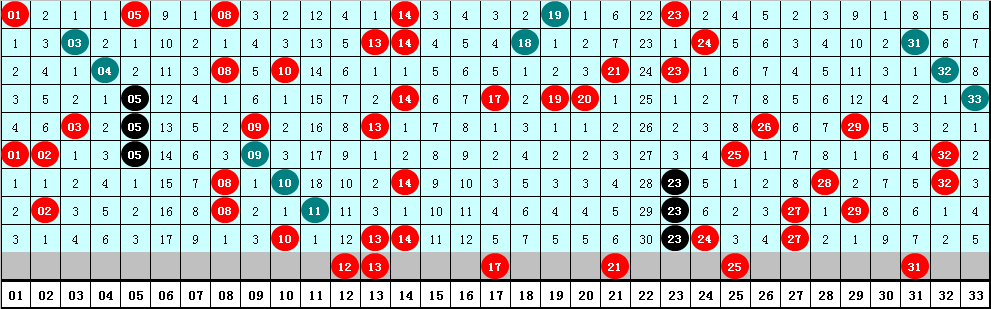 2、凤尾分析:最近十期凤尾号码分布在23-33区间,出现范围较广,凤尾在29两端次数比为6:4,基本持平,本期预计凤尾出现在29以上,参考号码31。