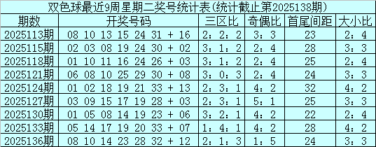 上期开奖:福彩双色球第2025138期奖号为:10 13 14 23 24 27 + 15,其中红球三区比为1:2:3,奇偶比为3:3,首尾间距为17,大小比为3:3。