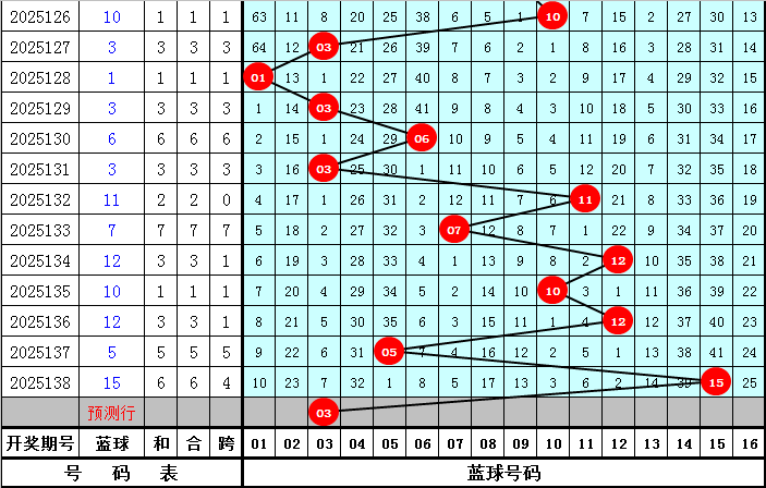 蓝球推荐:第139期历史同期开奖中,蓝球开出频次分别为:04、12、13出现0次,01、02、05、06、07、08、10、16出现1次,03、09、14、15出现2次,11出现3次,今年同期关注蓝球号码03。