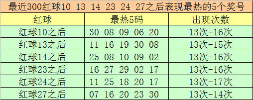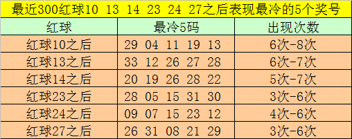 红球冷码统计:双色球第2025138期开出红球奖号分别为:10、13、14、23、24、27,在最近300期开奖中,各号码出现之后其下期出现最少的5个红球分别为: