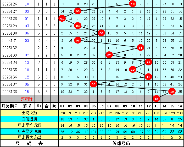 上期开出蓝球号码15,该号码在最近300期中出现了25次,其下期分别开出:蓝球14出现5次,蓝球02、04出现4次,蓝球08、13出现3次,蓝球05、07、12、15、16出现1次,蓝球01、03、06、09、10、11出现0次。本期五码蓝球参考04、06、09、12、13,独蓝关注13。