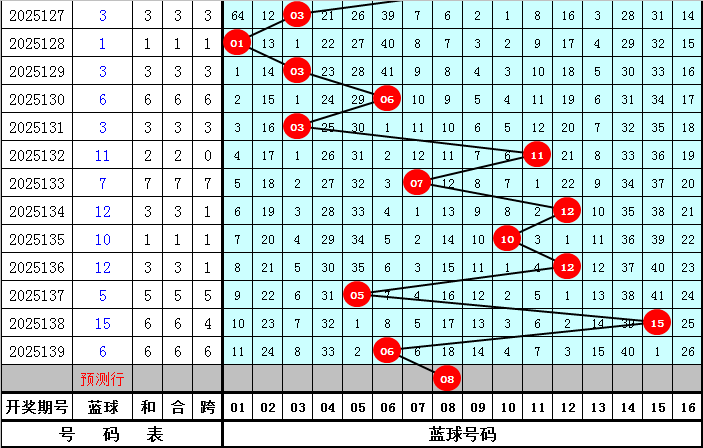 蓝球分析:第2025139期开出蓝球06,最近10期蓝球号码遗漏期数分别为:41期、1期、12期、12期、22期、8期、1期、35期、41期、8期,第2025140期蓝球注意02-10段出号,重点关注2路蓝球,参考蓝球:08。