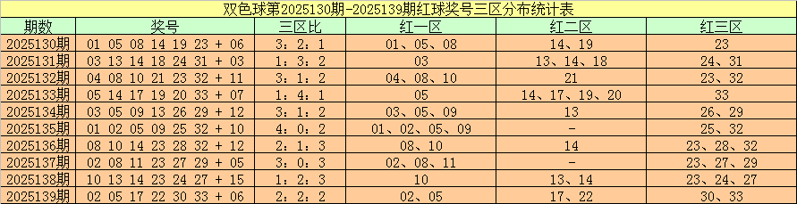 双色球第2025139期奖号为:02 05 17 22 30 33 + 06,红球三区比为2:2:2。