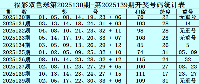 双色球第2025139期奖号开出:02、05、17、22、30、33 + 06,红球号码和值开出109,跨度开出31,开出重号0个:无重号。蓝球为0路号码。