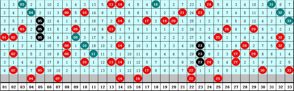 2、凤尾分析:最近十期凤尾号码分布在23-33区间,出现范围较广,凤尾012路为3:1:6,2路凤尾出现较多,本期预计凤尾为1路,参考号码25。