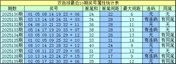 上期开奖:福彩双色球第2025139奖号为:02 05 17 22 30 33 + 06,红球和值为109,最大间距为12,奇偶比为3:3,三区比为2:2:2。