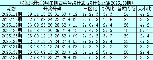 大小比分析:最近9周星期四红球大小 号开出个数比为30:24,大号红球热出,本期预计大小红球平衡出号,关注大小比3:3。