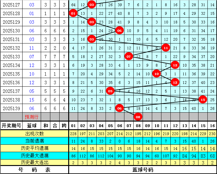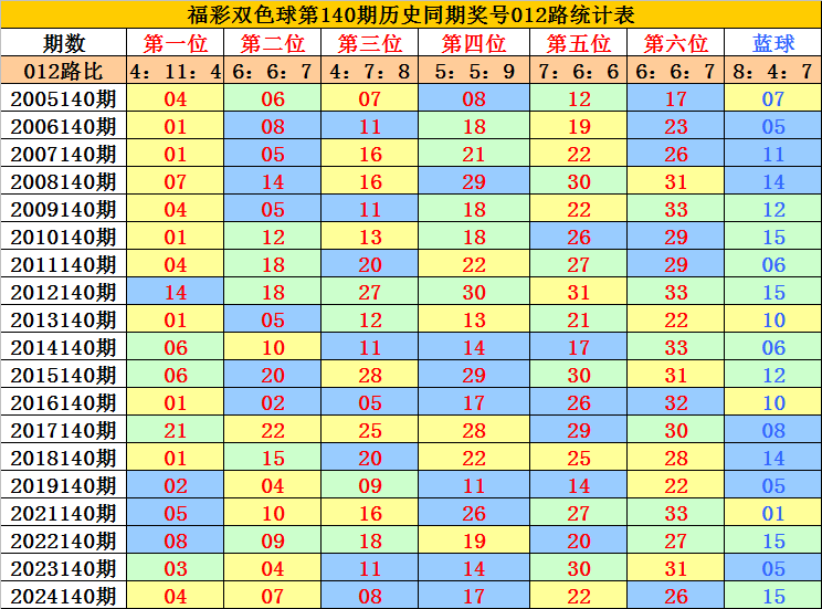 蓝球分析:第140期历史同期蓝球号码012路比开出8:4:7,其中1路蓝球开出较少,本期预计1路蓝球轮空,看好蓝球08。