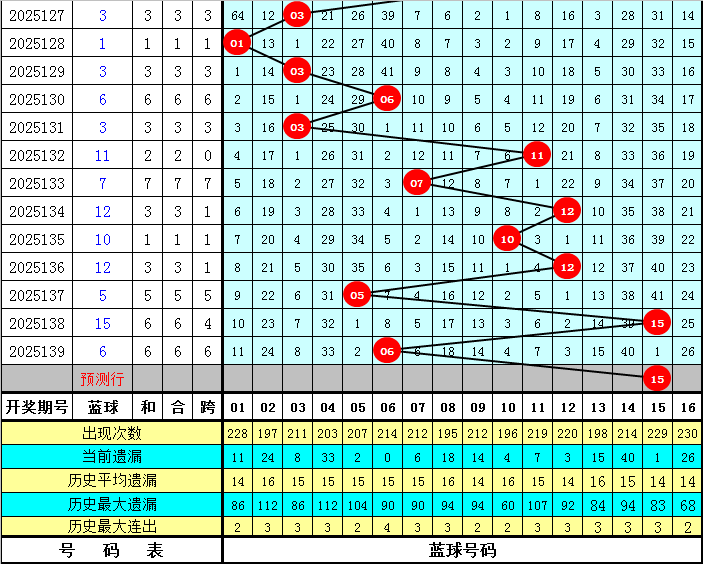 蓝球分析:上期蓝球开出小 号06,最近10期蓝球号码大小比为5:5,大小蓝球走势相当,本期蓝球关注大号,推荐号码15。