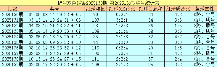 福彩双色球第2025139期红球奖号为:02、05、17、22、30、33,蓝球奖号为:06,其中红球和值为109,012路比为2:1:3,首尾和为35,质合比为3:3,蓝球属性为0路、合号。