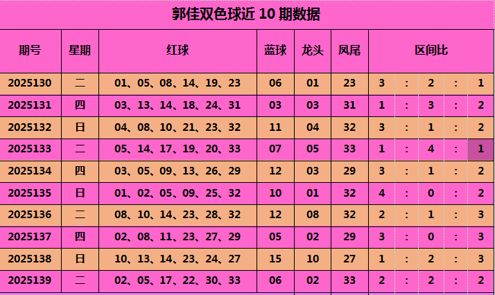 上期凤尾33,凤尾最近10期分别是23、31、32、33、29、32、32、29、27、33,奇偶比为7:3,奇数球开出次数较多,综合分析,本期凤尾参考:32。