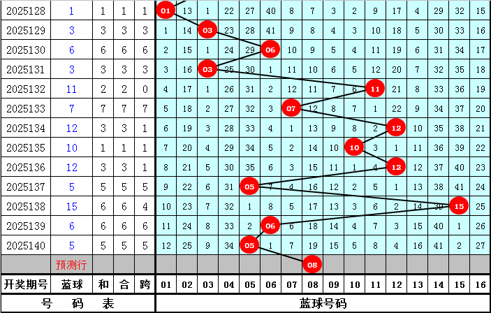 在历史同期第141期开奖中:蓝球号码012路比为8:4:7,本期注意蓝球开出2路号码,精选蓝球号码08。