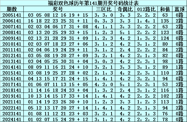 在第141期历史同期奖号中,红球三区分布总比例为41:40:33,奇偶总比例为69:45,012路比为39:38:37,和值分布在53-135之间,蓝球号码012路总比例为8:4:7。