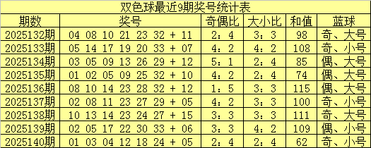 奇偶比:上期红球奇偶比为2:4,其中偶号红球表现活跃,最近9期红球奇偶比为28:26,奇偶红球走势相当,本期看好奇数红球走热,预计奇偶比为4:2。