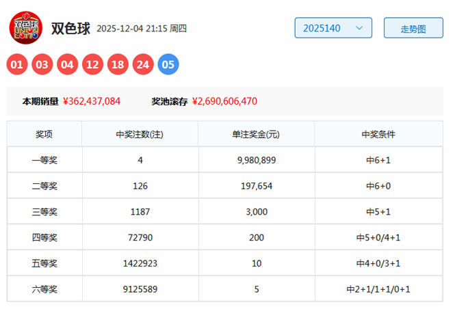 双色球第2025140期开出奖号为01、03、04、12、18、24+05。其中红球号码奇偶比为2:4,三区比为3:2:1,大小比为2:4,蓝球开出奇数号码05。