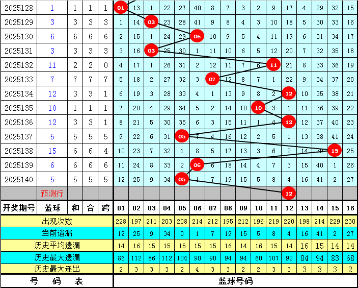 蓝球分析:前5期蓝球号码分别开出:12、05、15、06、05,其中偶数蓝球出现2期,走势较冷,本期注意偶数蓝球回补,看好蓝球号码12。