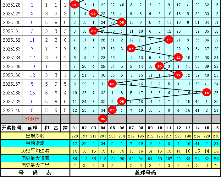 一号球分析:上期开出奖号01,该位最近10期出现范围在01-10之间,中点为5.5,其中中点以下的奖号开出8次,中点以上的奖号出现2次,本期该位继续关注中点以下的红球,考虑号码03。