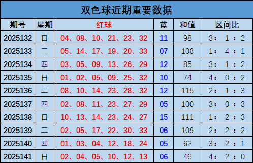 双色球上期开出奖号:02 04 05 10 12 13+06,和值46,区间比4:2:0