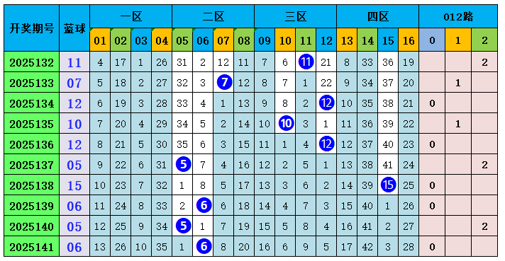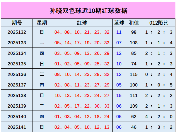上期回顾:双色球第2025141期开出奖号:红球02、04、05、10、12、13;蓝球06,其中红球和值为46,012路比为1:3:2,奇偶比2:4,蓝球开出小偶数号码06。