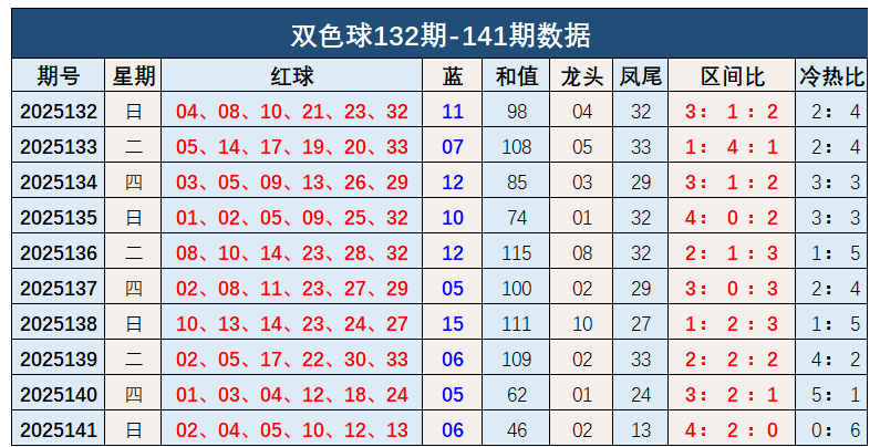 双色球第2025141开奖奖号:红球02、04、05、10、12、13,蓝球06。和值46,龙头02,凤尾13,区间比4:2:0,冷热比0:6。蓝球开出小数号码06。