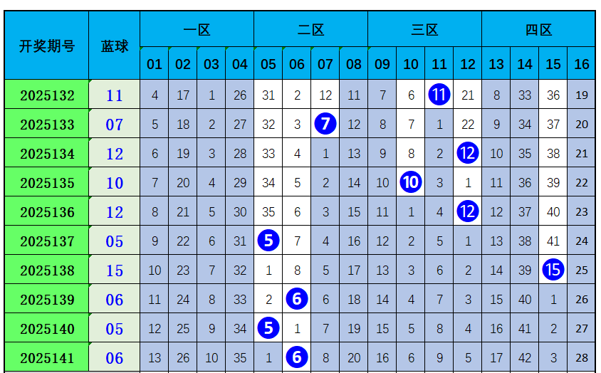 上期开出蓝球号码06,近10期,一区开出0次,二区开出5次,三区开出4次,四区开出1次,总体走势:一区表现较冷,本期看好蓝球号码:15。