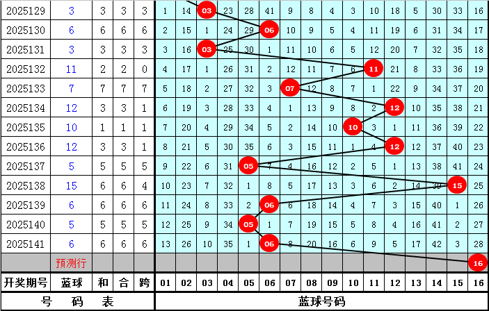 蓝球分析:第2025141期开出蓝球06,最近10期蓝球号码遗漏期数分别为:12期、12期、22期、8期、1期、35期、41期、8期、2期、1期,第2025142期蓝球注意05-16段出号,重点关注1路蓝球,参考蓝球:16。