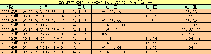双色球第2025141期奖号为:02 04 05 10 12 13 + 06,红球三区比为4:2:0。