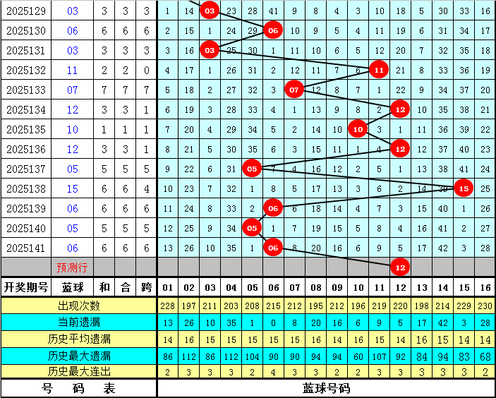 蓝球分析:近期大号蓝球出现较少,本期适当关注大号蓝球转热,蓝球参考09、11、12、15。