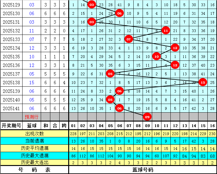 遗漏分析:最近7期红球遗漏总值分别为:20、19、29、11、53、38、6,开出3个遗漏值9以上的冷码红球,目前红球遗漏值9以上的冷码红球有5个:06、07、15、16、31,本期注意冷码解冻,参考红球号码06、16。